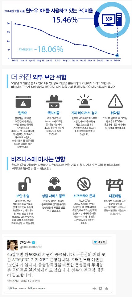 아래의 글은 공식 윈도우 홈페이지에서 발췌한 글 입니다. Microsoft에서 Window XP 및 Office 2003에 대한 지원을 종료하는 이유가 무엇입니까? 2002년 Microsoft는 Microsoft 제품의 지원 옵션에 대한 투명성과 예측 가능성을 높여달라는 고객의 지속적인 의견을 반영하여 개발한 제품 지원 기간 정책을 발표했습니다. 이 정책에 따라 Windows 및 Office 제품을 포함한 Microsoft 기업용 및 개발자용 제품은 지원되는 서비스 팩 수준에서 최소 10년(기본 지원 5년 및 추가 지원 5년) 동안 지원을 받습니다. IT 비즈니스의 가치를 높이려면 단순한 지원뿐만 아니라 기술 혁신이 필요합니다. 2001년에는 상상에서만 가능했던 컴퓨터 기능을 오늘날 대부분의 사용자가 당연하게 사용합니다. 다양한 기기를 사용하여 어디에서나 연결하고, 소셜 네트워킹에 적극적으로 참여하고, 클라우드 컴퓨팅을 활용하는 것은 지난 10년 동안 발생한 지각 변동의 세 가지 예에 지나지 않습니다. Windows 7 및 Office 2010은 처음부터 이러한 기능을 포함하여 오늘날의 사용자가 원하는 다양한 기능을 제공하도록 설계되었기 때문에 지금까지의 버전 중에서 가장 빠르게 사용자층이 넓어지고 있습니다. 동시에, 이전 버전의 사용자 수가 감소함에 따라 Microsoft는 Windows XP 및 Office 2003에 대한 지원을 2014년 4월 8일 종료할 예정이며, 이로써 Windows XP에 대해 12년 동안 그리고 Office 2003에 대해 10년 동안 고객 지원을 제공하게 됩니다.