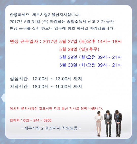 2016년 귀속 개인 종합 소득세 신고기간 연장 근무 안내공지
