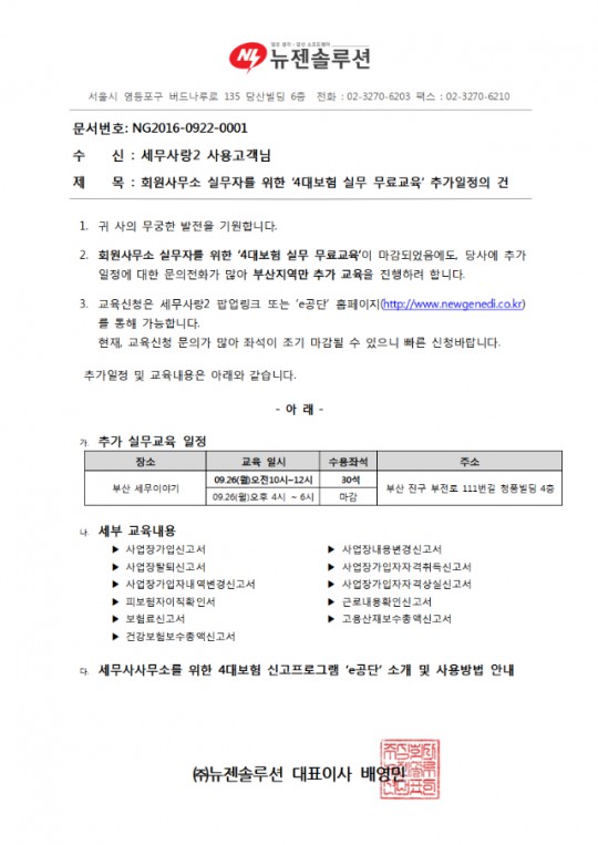 회원사무소 실무자를 위한 '4대보험 실무 무료교육' 추가일정의 건