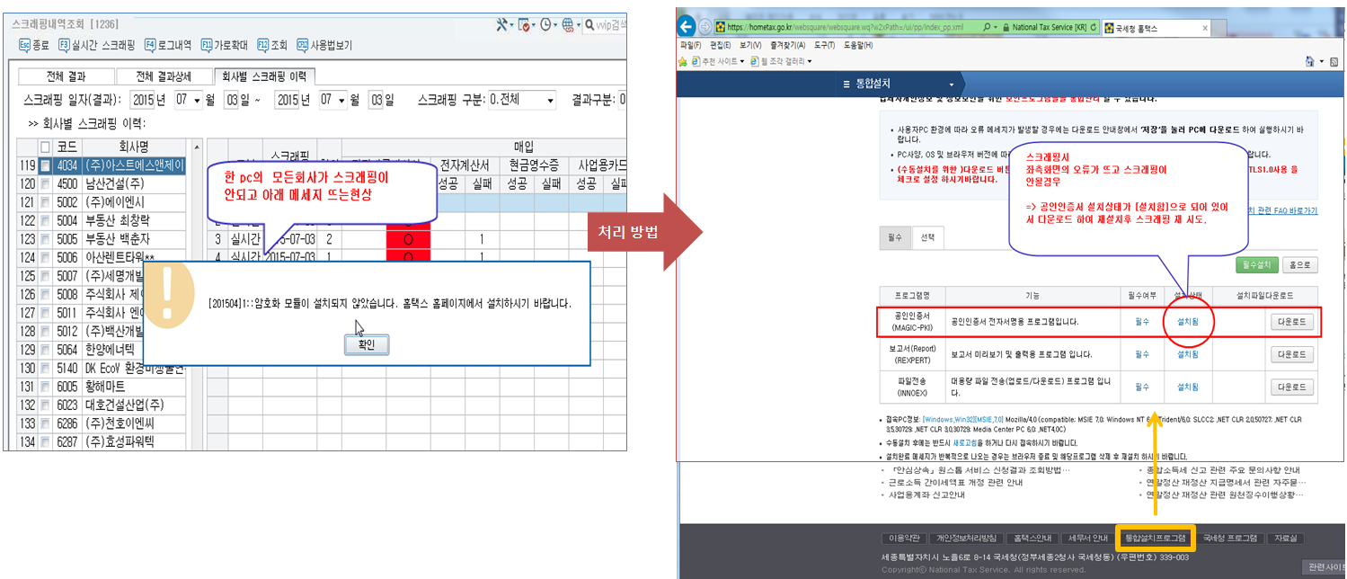스크래핑내역조회 _ 한 pc에 모든회사가 스크래핑이 안되고 암호화 모듈이 설치되지 않았습니다.