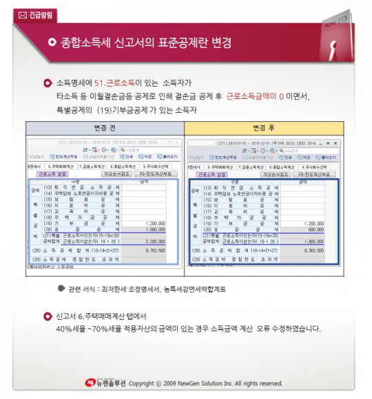 [공지사항] 2014.05.29 공지사항 안내입니다. 종합소득세 신고서의 표준공제란이 변경되었습니다. (아래내용 참고) 소득명세서 51. 근로소득이 있는 소득자가 사업소득결손공제 또는 이월결손금공제 후 근로소득금액이 0원이면서, 특별공제의 (19) 기부금공제가 있는 소득자의 경우에는 표준공제는 60만원으로 변경되었습니다. (2014.05.29 업데이트 전에는 100만원으로 공제하였습니다.) ※ 업데이트 전 신고한 부분이 있다면, 재 확인하시고 신고서변동시 다시 신고 부탁드립니다. 이미 종합소득세를 납부한 경우에는 소득세 추가 발생분만 기재하여 추가 납부하시면 됩니다. 업무에 불편을 드려서 죄송합니다.